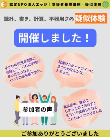 こどもたちの理解と支援をより深めたい方に、支援者養成講座がございます。ぜひご受講ください。https://npo-edge.jp/support/