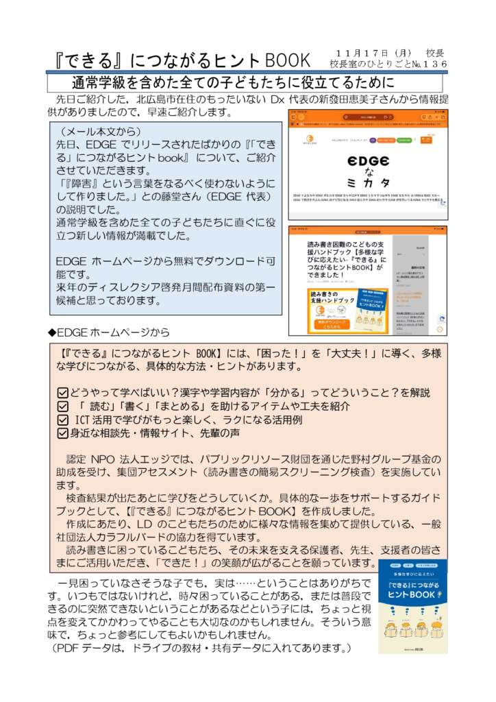 北海道北広島市では、ある小学校の校長先生がおたよりで関係者に紹介してくださいました↓