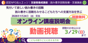 2026年1月24日(土)に開催致しました、「読み書き困難指導・支援講座」講座説明会の動画をご視聴いただけます。