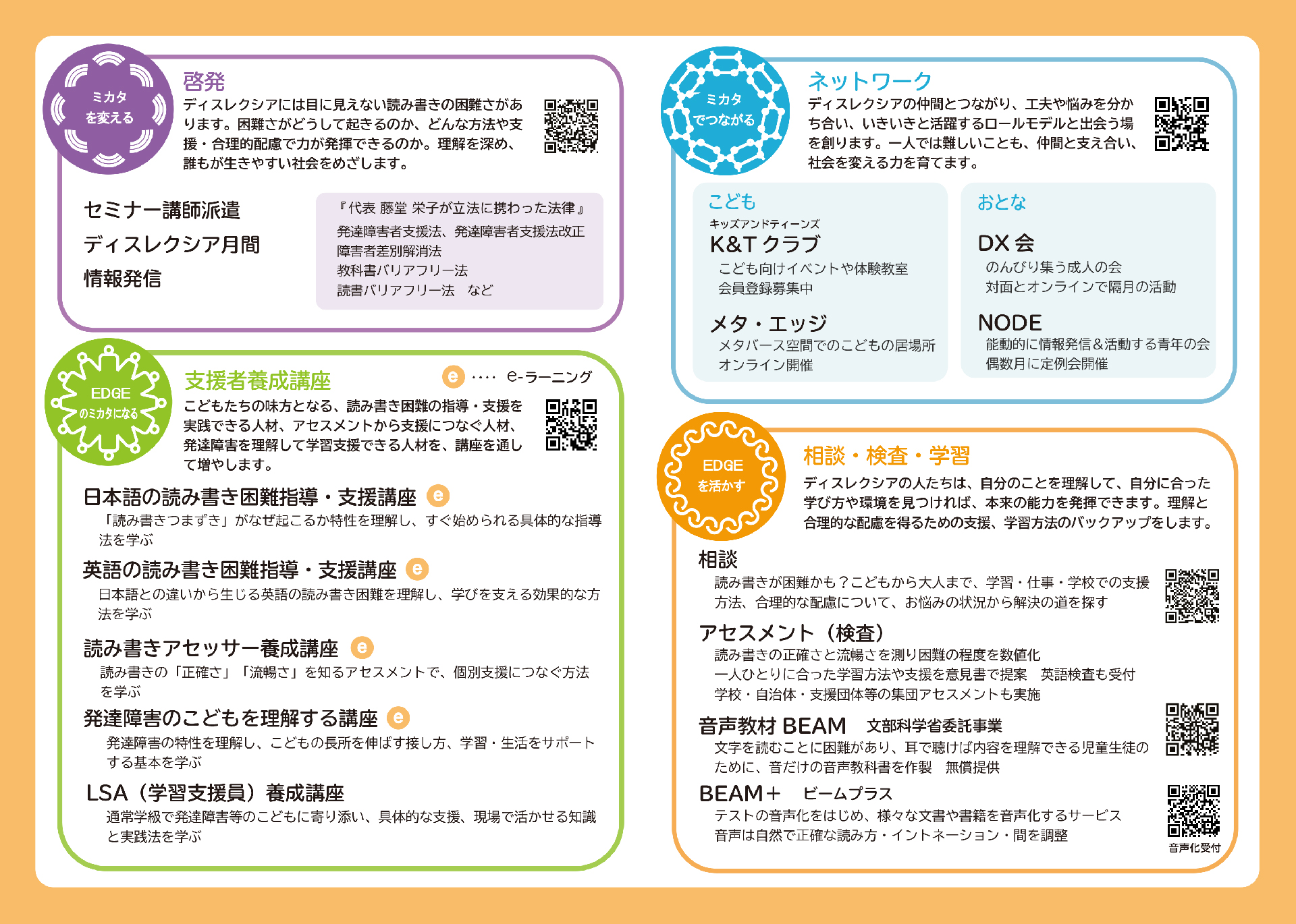 NPO法人エッジはディスレクシアの正しい認識の普及と支援を目的とした特定非営利活動法人として、2001年10月に認定設立され活動しています。